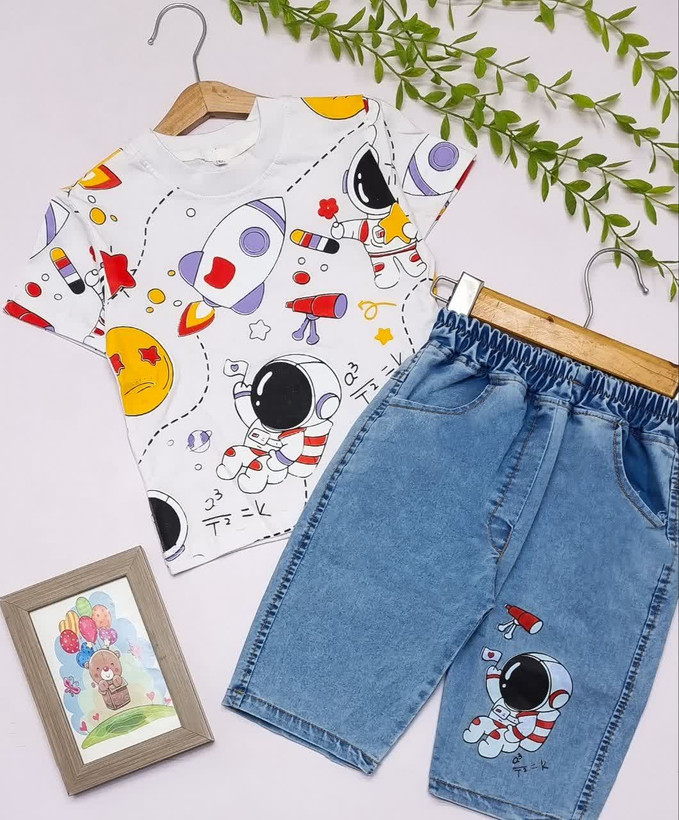تیشرت و شلوارک پسرانه طرح فضانورد تیشرت پنبه شلوارک لی سایز ۴۵/۵۰/۵۵